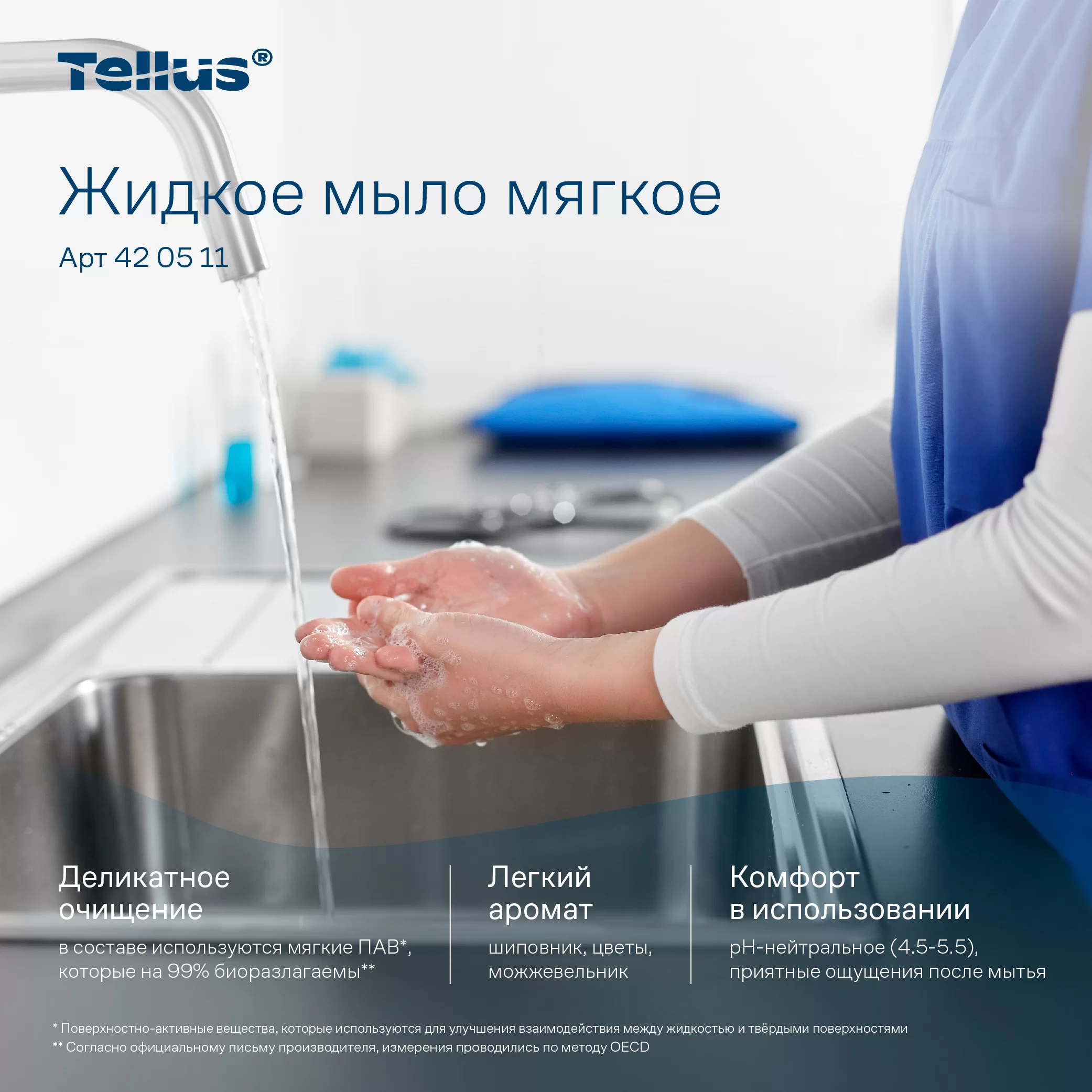 - Главные функции и преимущества товара жидкое мыло мягкое (SC1) Tellus 1 литр (артикул 420511):