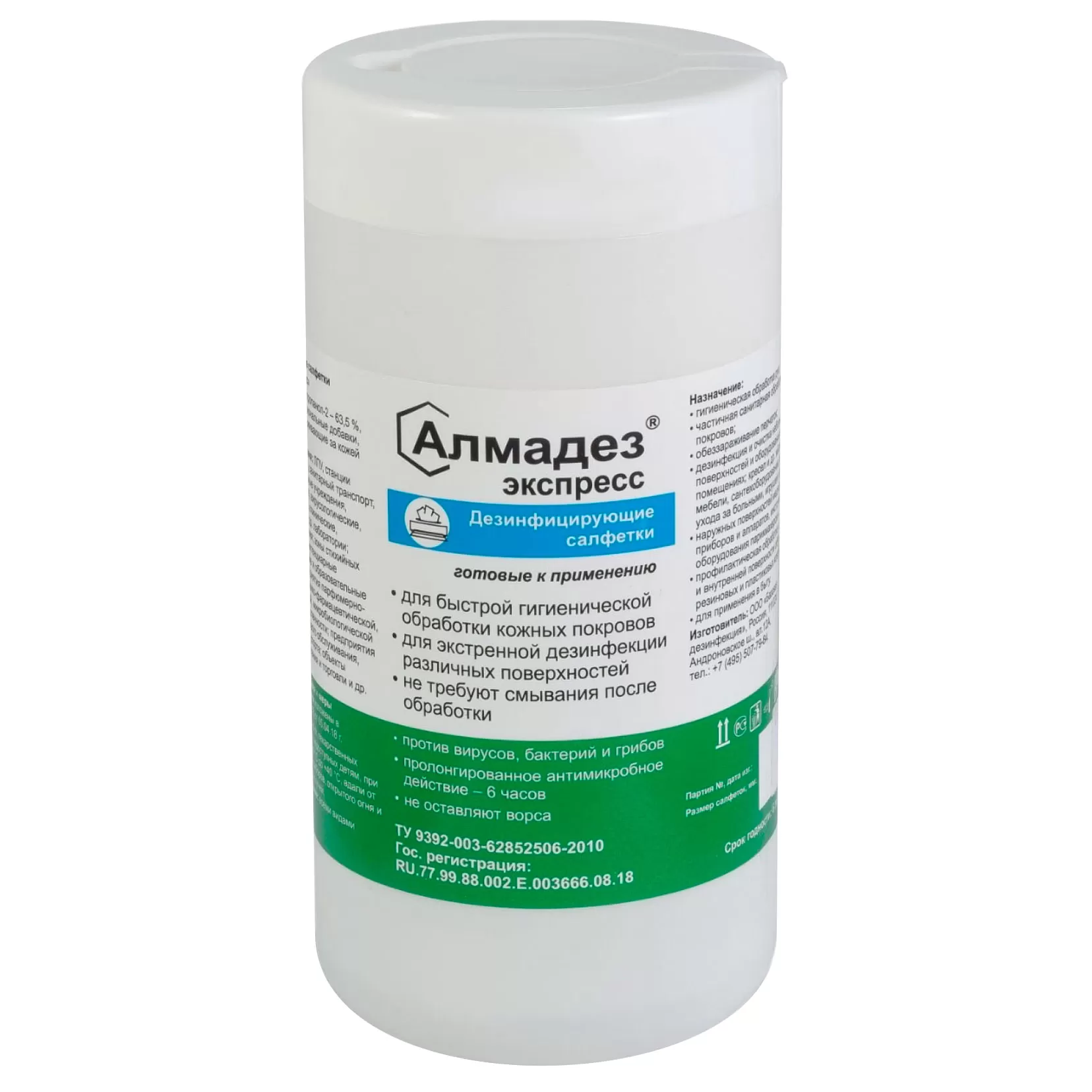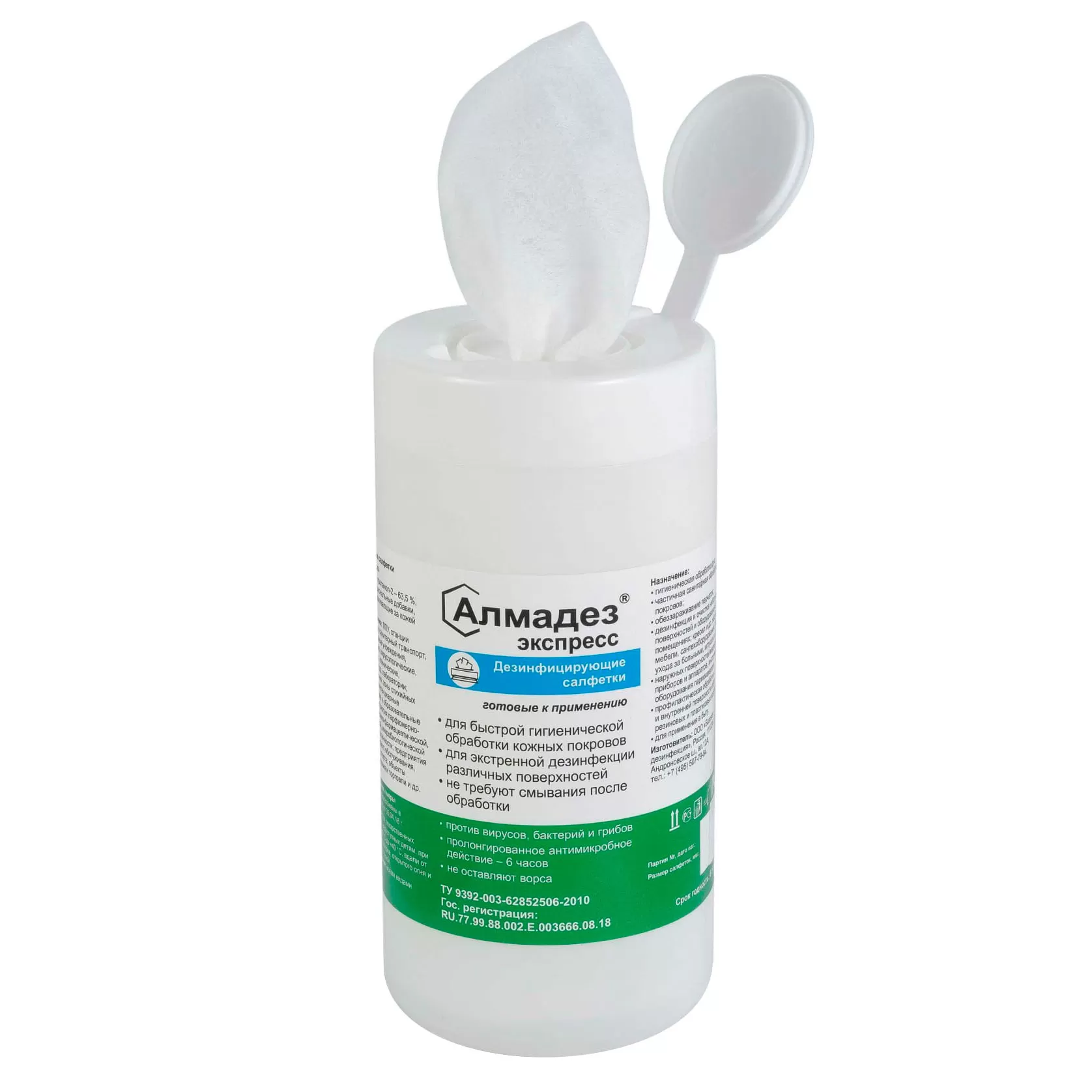 Салфетки влажные для личной гигиены АЛМАДЕЗ Экспресс 140х180 мм, в банке готовые САЛ-В-11 из нетканого материала, равномерно пропитанные дезинфицирующим средством "Алмадез Экспресс".