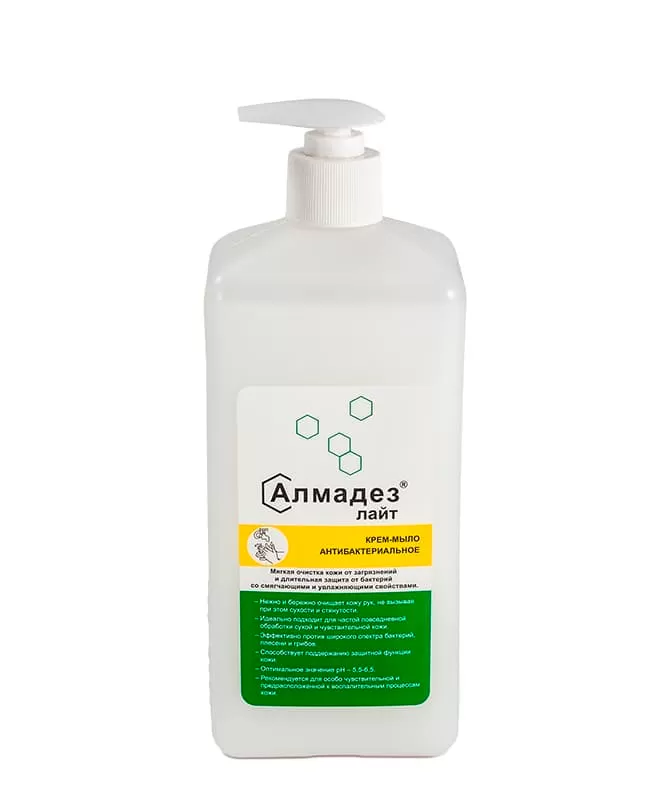 Крем-мыло антибактериальное «Алмадез-лайт» представляет собой гелеобразную жидкость белого цвета с легким запахом применяемой отдушки. Содержит антибактериальную добавку ундециленамидопропиллтримониум метосульфат (Тетранил У), в качестве моющей основы — комплекс ПАВ, в качестве умягчающей и ухаживающей за кожей добавки — глицерин, кокамидопропил бетаин и диэтаноламид кокосового масла.