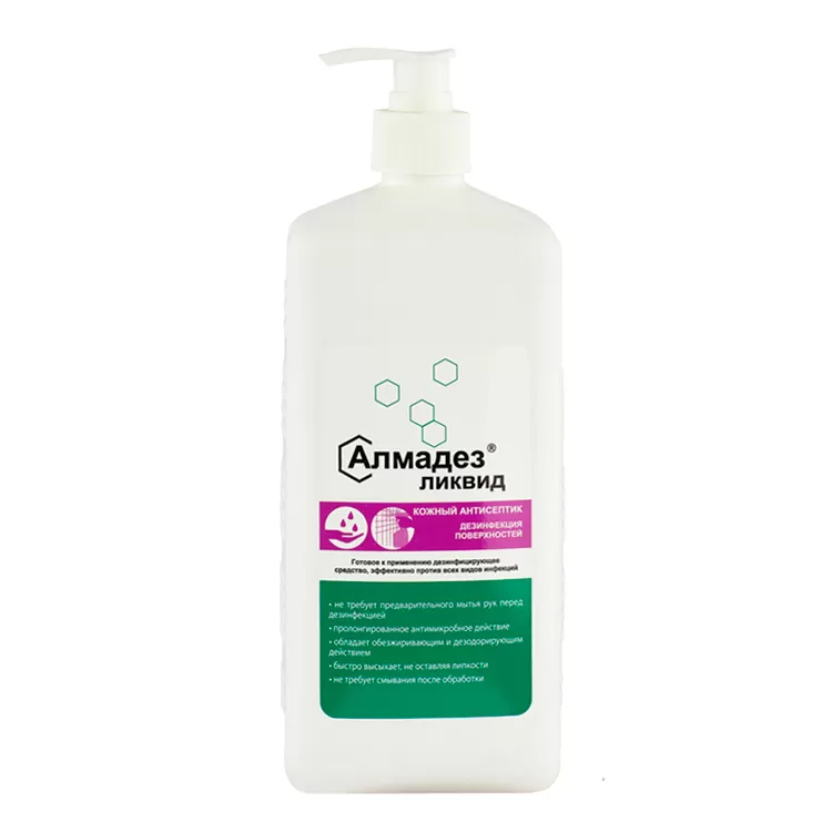 - Может использоваться в качестве пропиточного раствора для сухих салфеток, помещенных в диспенсерную систему «Алмадез».
