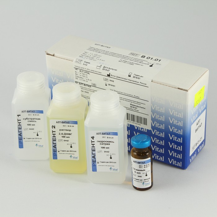 Диагностический набор АЛТ-ВИТАЛ для определения активности аланинаминотрасферазы (АЛТ) в сыворотке или плазме крови унифицированным динитрофенилгидразиновым методом Райтмана-Френкеля.