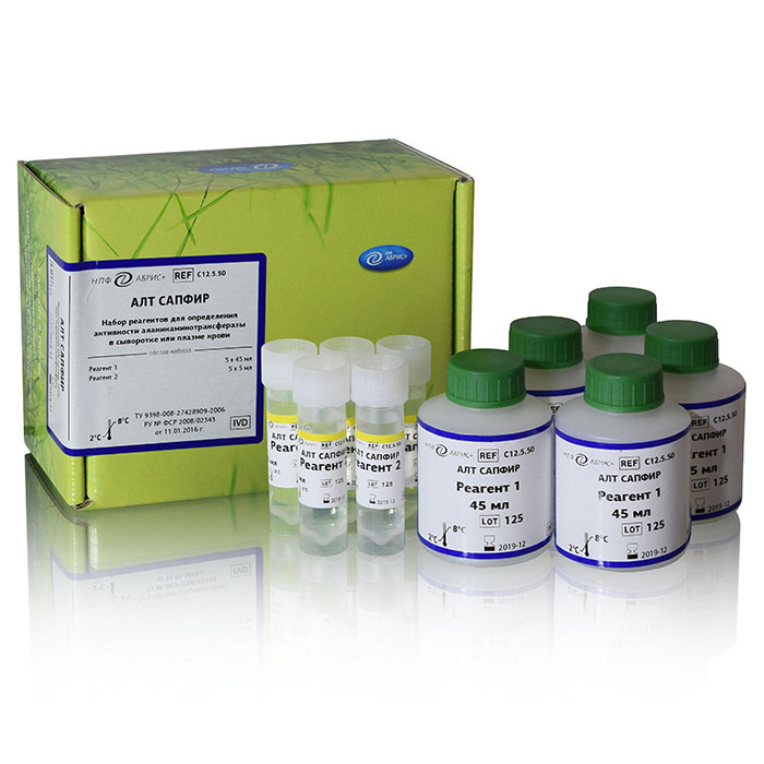 Набор реагентов для определения активности аланинаминотрансферазы в сыворотке или плазме крови кинетическим методом.