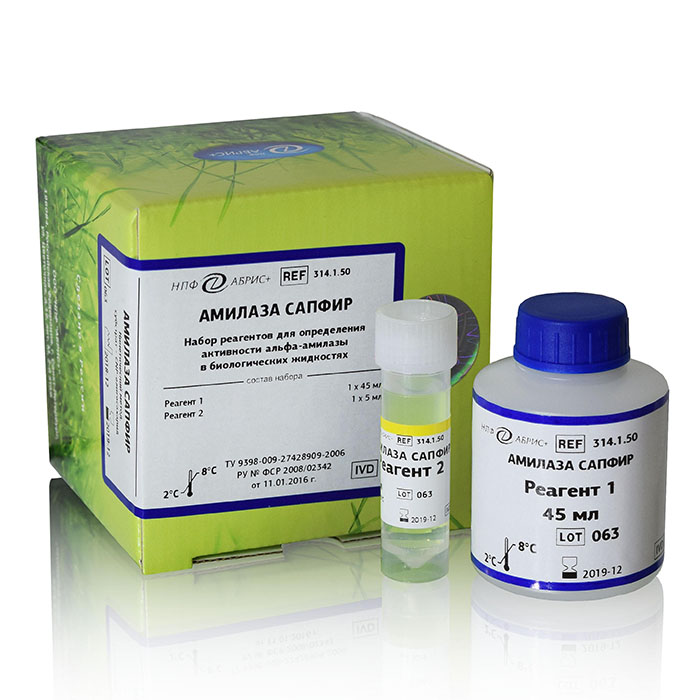 Набор реагентов для определения активности альфа-амилазы в биологических жидкостях кинетическим методом.