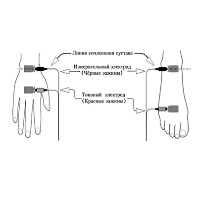 - Измерительные электроды устанавливаются так, чтобы линии разделения кисти и предплечья, стопы и голени пролегали под осью симметрии электродов.