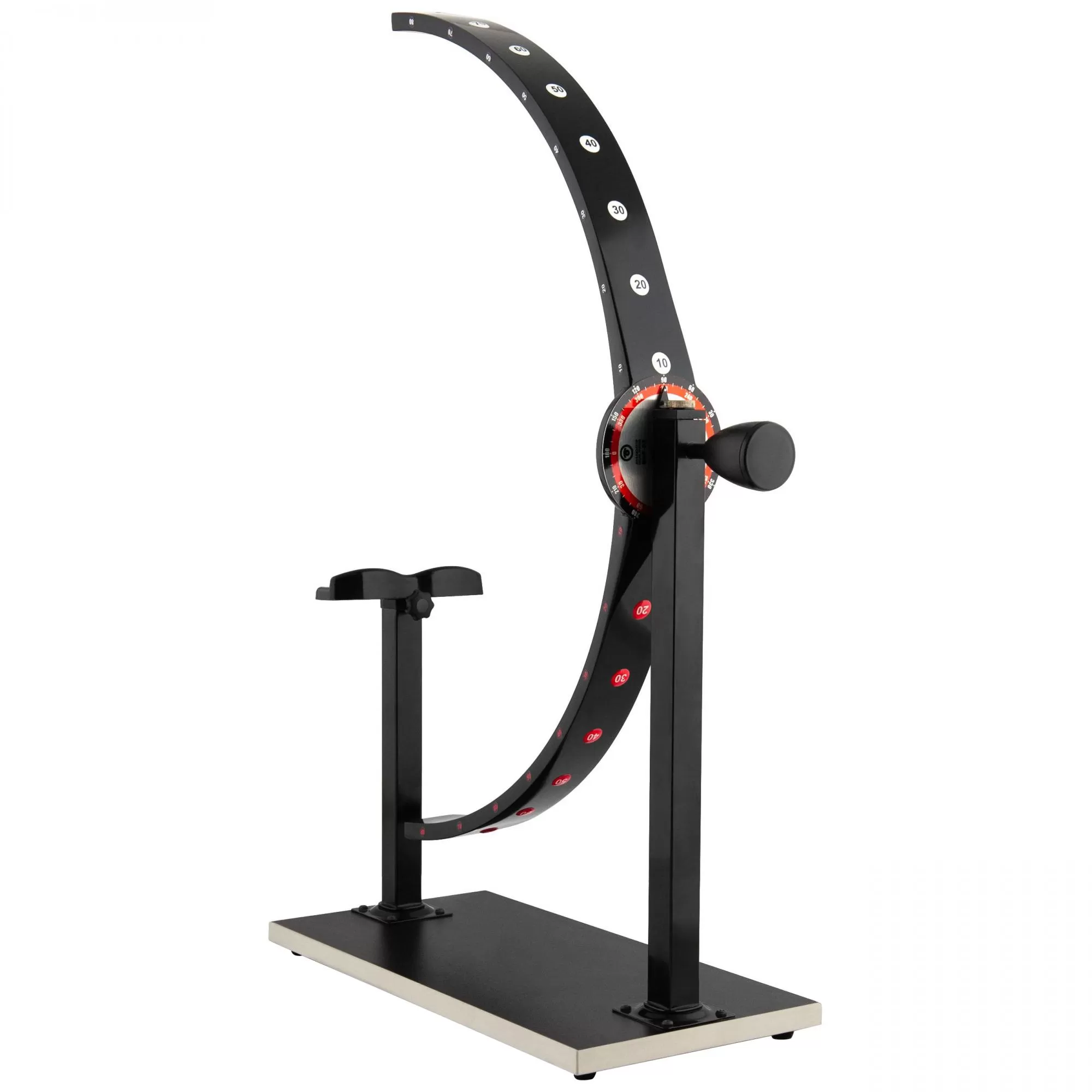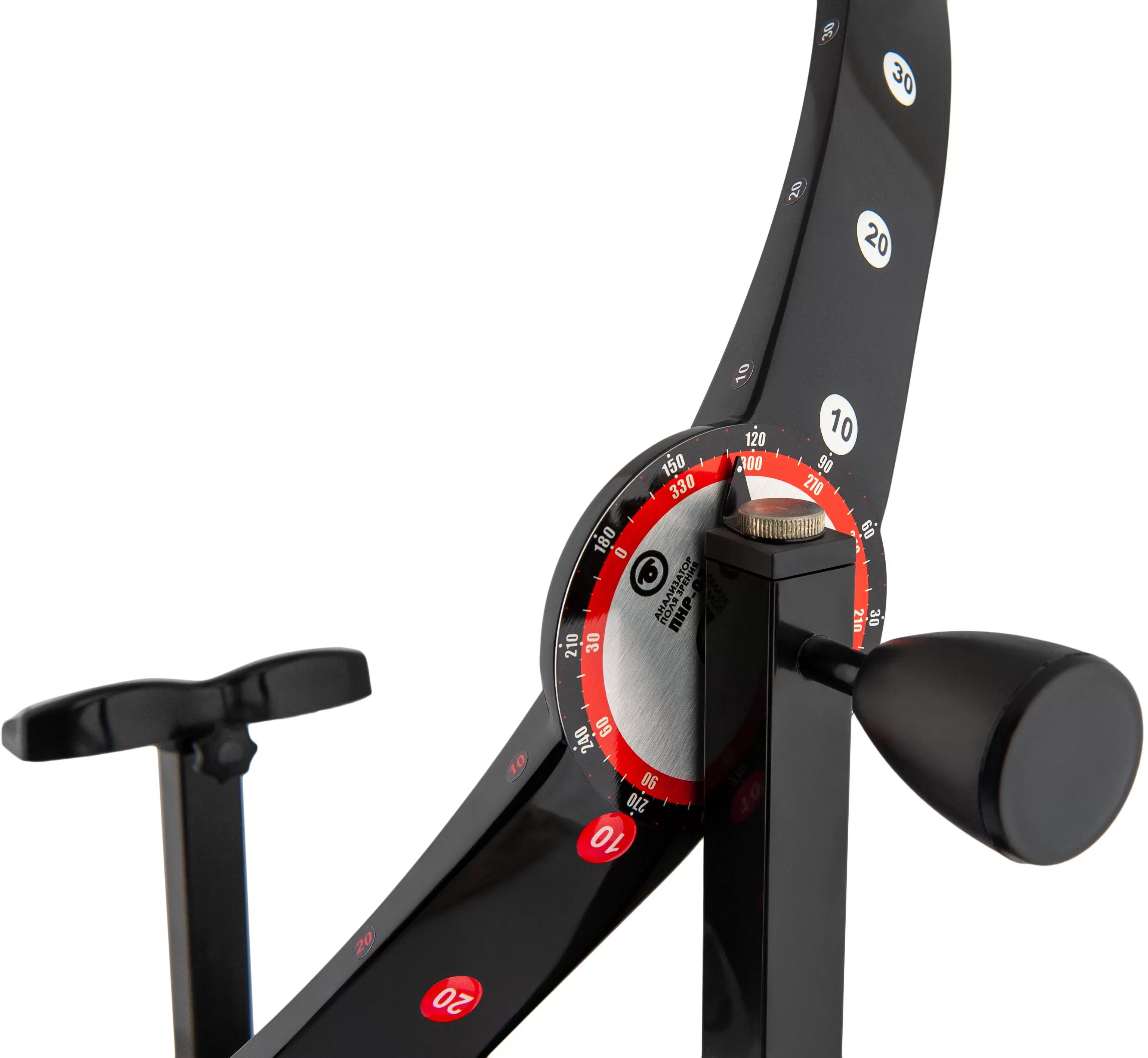 Каждая половина дуги обозначена своим цветом (белым и красным) в соответствии с разметкой на центральной дисковой шкале - это облегчает работу на периметре, упрощает нанесении результатов на бланк и позволяет избежать ошибок. Для удобства пользования градусная разметка дуги нанесена с трех сторон (включая две боковые), что позволяет видеть ее при любом положении дуги.