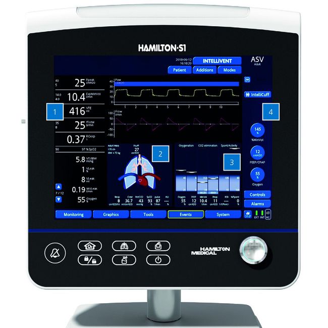 Помимо этого, в аппарате ИВЛ HAMILTON-S1 предусмотрены стандартный интерфейс пользователя Ventilation Cockpit, разработанный компанией Hamilton Medical, и уникальный режим интеллектуальной адаптивной поддерживающей вентиляции ASV.