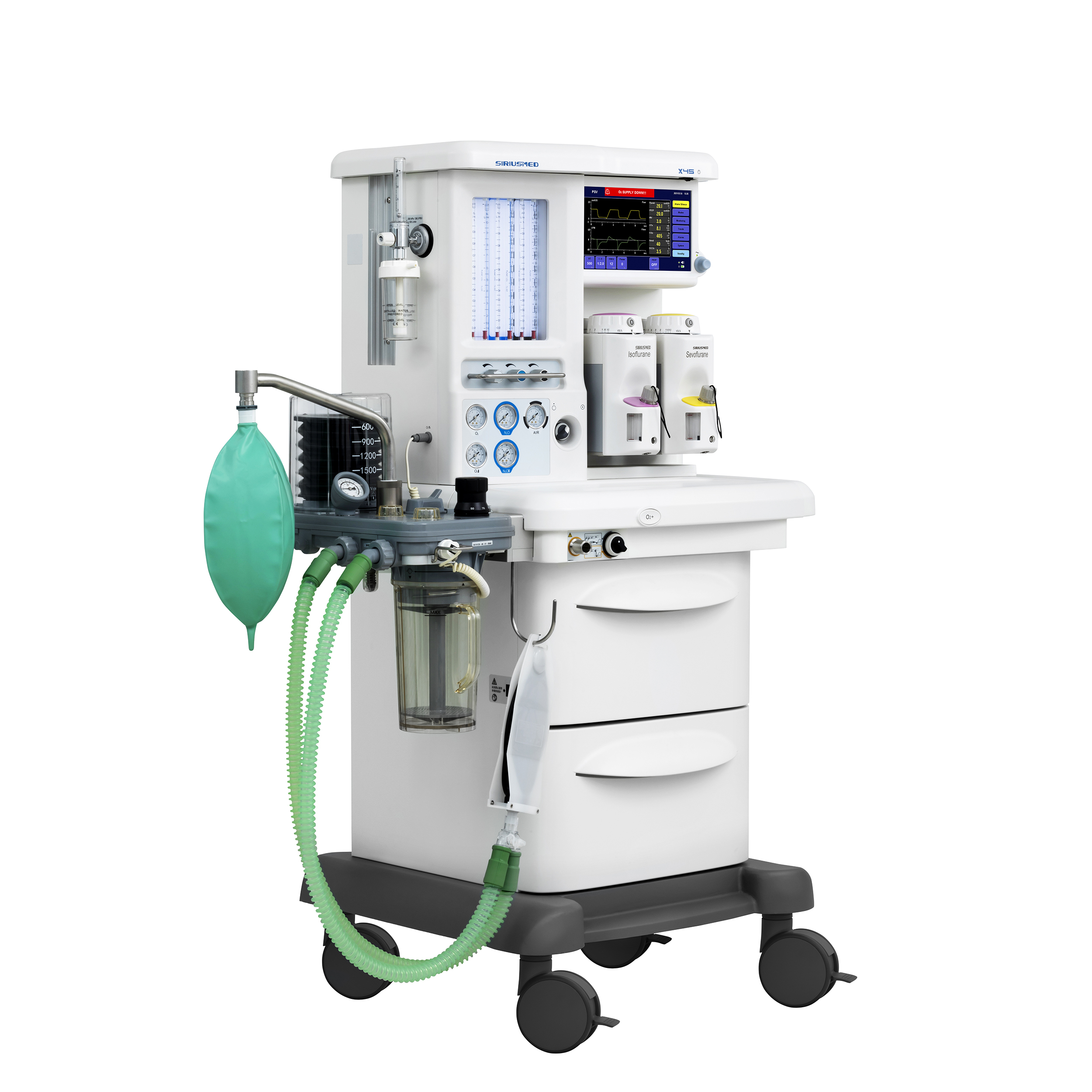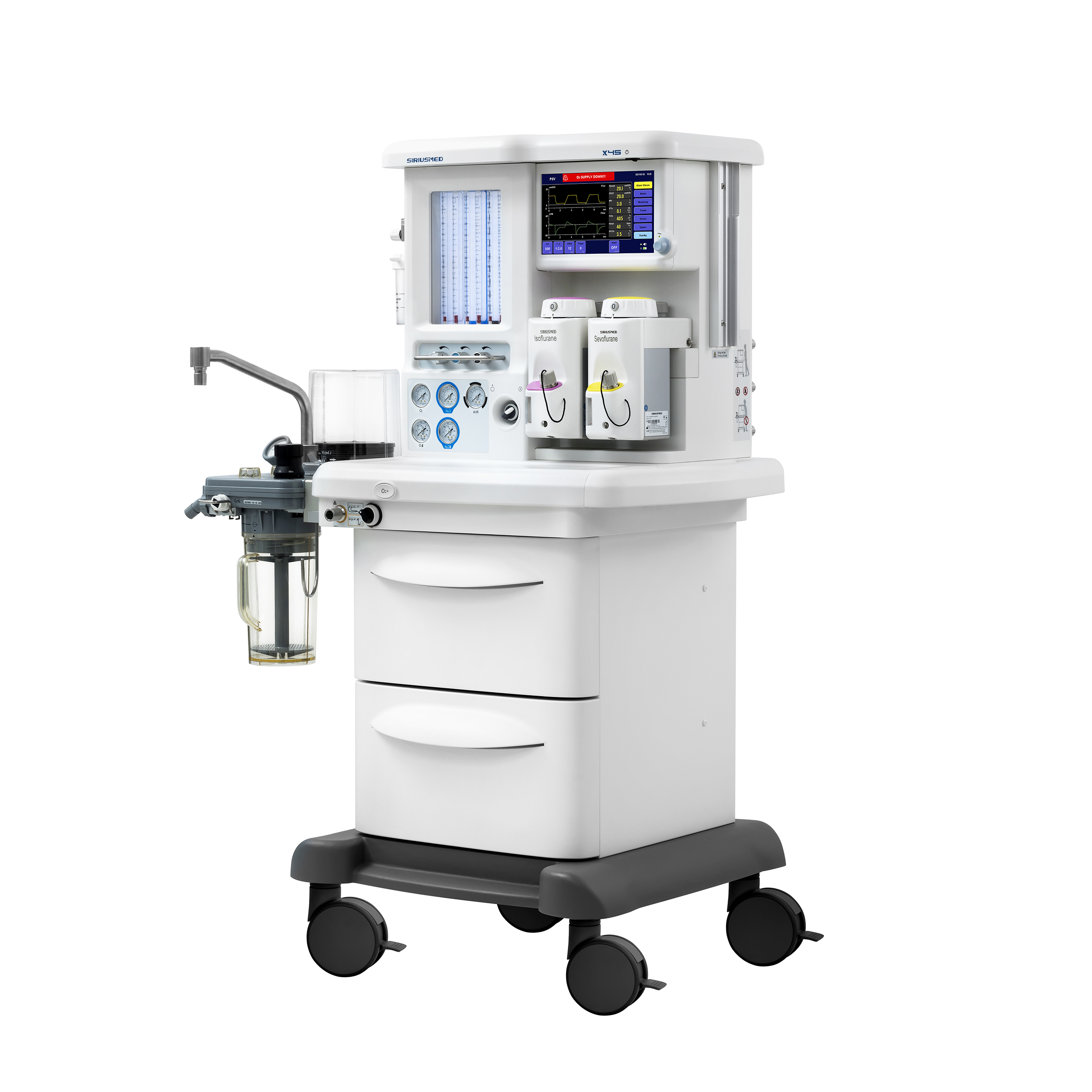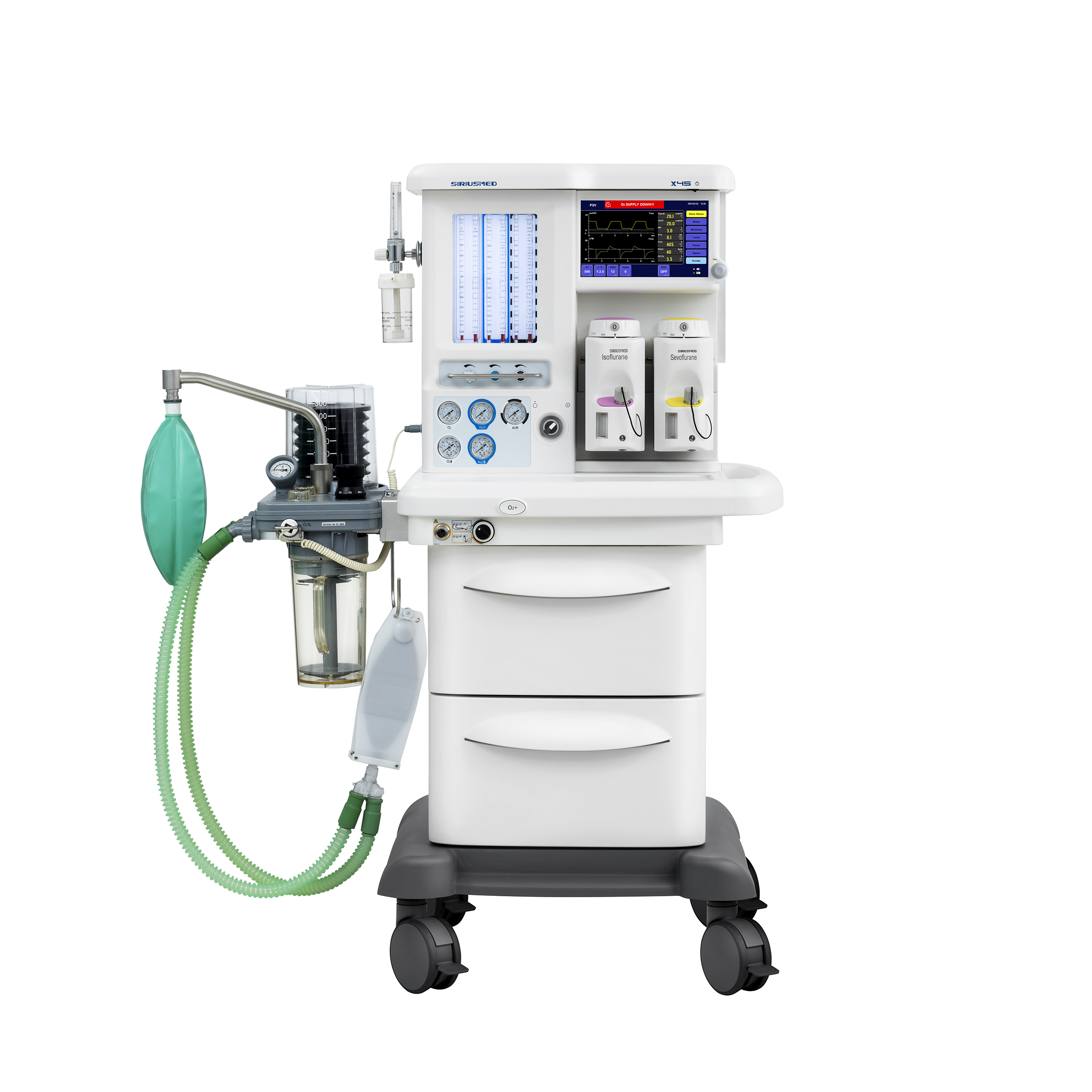 Тележка. Базовая комплектация уже имеет расширенную комплектацию для работы анестезиолога. Трехгазовая версия (О2, AIR, N2O). База на два испарителя SelectatecInterlock. Рельсы с обеих сторон для крепления монитора пациента и ПК. Крепление для двух резервных баллонов О2 и N2O. Три встроенные медицинские розетки 220В для дополнительного оборудования. Светодиодная подсветка рабочего столика и механических ротаметров. Центральный тормоз фиксирует все 4 колеса одной педалью. Подставка для ног врача. Встроенная батарея на 90 минут. Два вместительных выдвижных ящика. Встроенные порты VGA и USB.