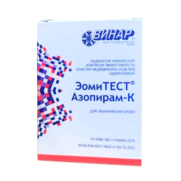 Индикаторы ЭомиТЕСТ® Азопирам предназначены для обнаружения остатков крови, следов ржавчины, стирального порошка с отбеливателем, окислителей (Хлорамина, Хлорной извести, Хромовой смеси и др.), пероксидаз растительного происхождения (растительных остатков) и кислот на изделиях медицинского назначения при контроле качества их предстерилизационной очистки в лечебно-профилактических учреждениях, санитарно-эпидемиологических и дезинфекционных станциях.