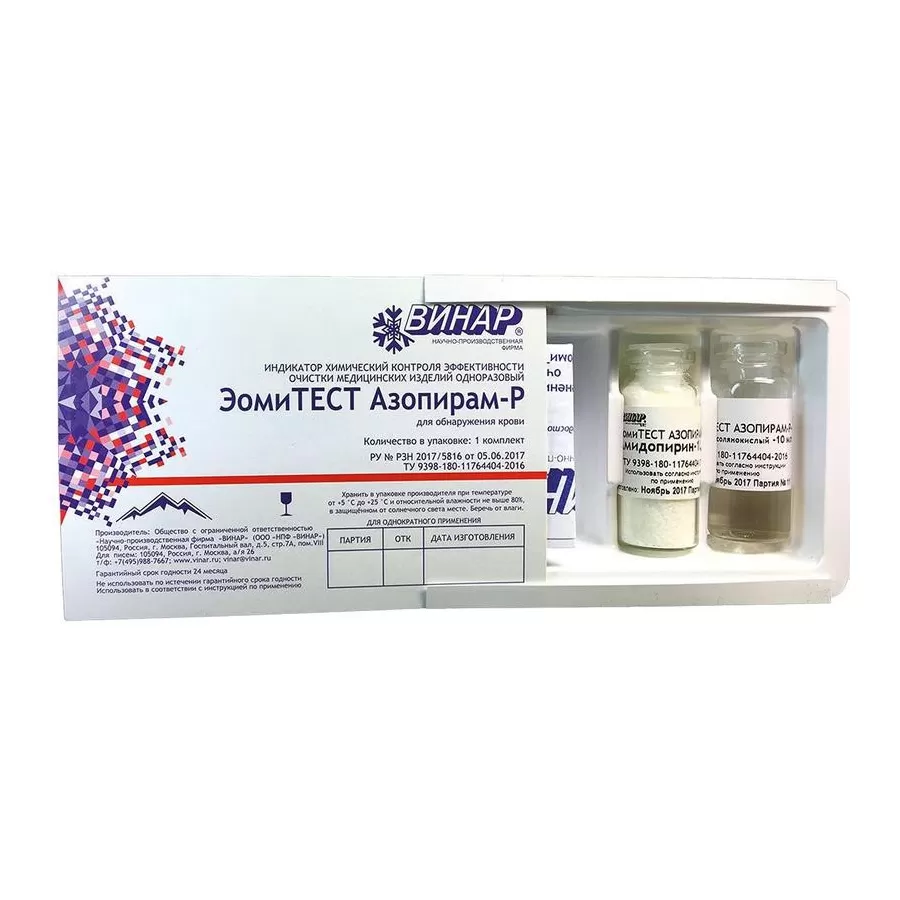 Индикаторы ЭомиТЕСТ® Азопирам предназначены для обнаружения остатков крови, следов ржавчины, стирального порошка с отбеливателем, окислителей (Хлорамина, Хлорной извести, Хромовой смеси и др.), пероксидаз растительного происхождения (растительных остатков) и кислот на изделиях медицинского назначения при контроле качества их предстерилизационной очистки в лечебно-профилактических учреждениях, санитарно-эпидемиологических и дезинфекционных станциях.