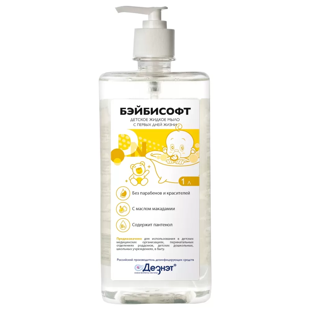 "Бэйбисофт" - детское жидкое мыло во флаконе с дозатором.