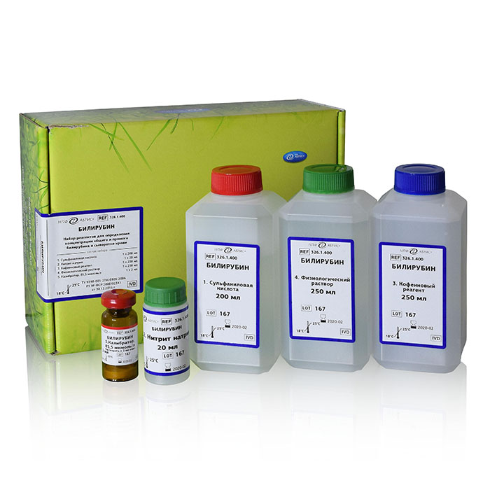 Набор реагентов для определения концентрации общего и прямого билирубина в сыворотке крови методом Йендрассика-Грофа (200+200 определений при конечном объеме 2 мл).