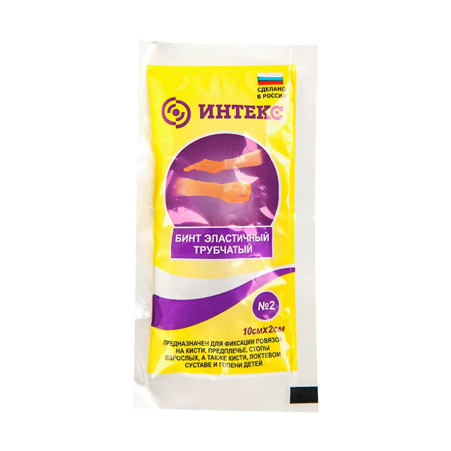 Бинт трубчатый №2 Интекс в индивидуальной упаковке (в упаковке 20 штук) 10 смХ2 см предназначен для фиксации сухих и влажных повязок на кисти, предплечье, стопе у взрослых, а также кисти, локтевом суставе и голени у детей.