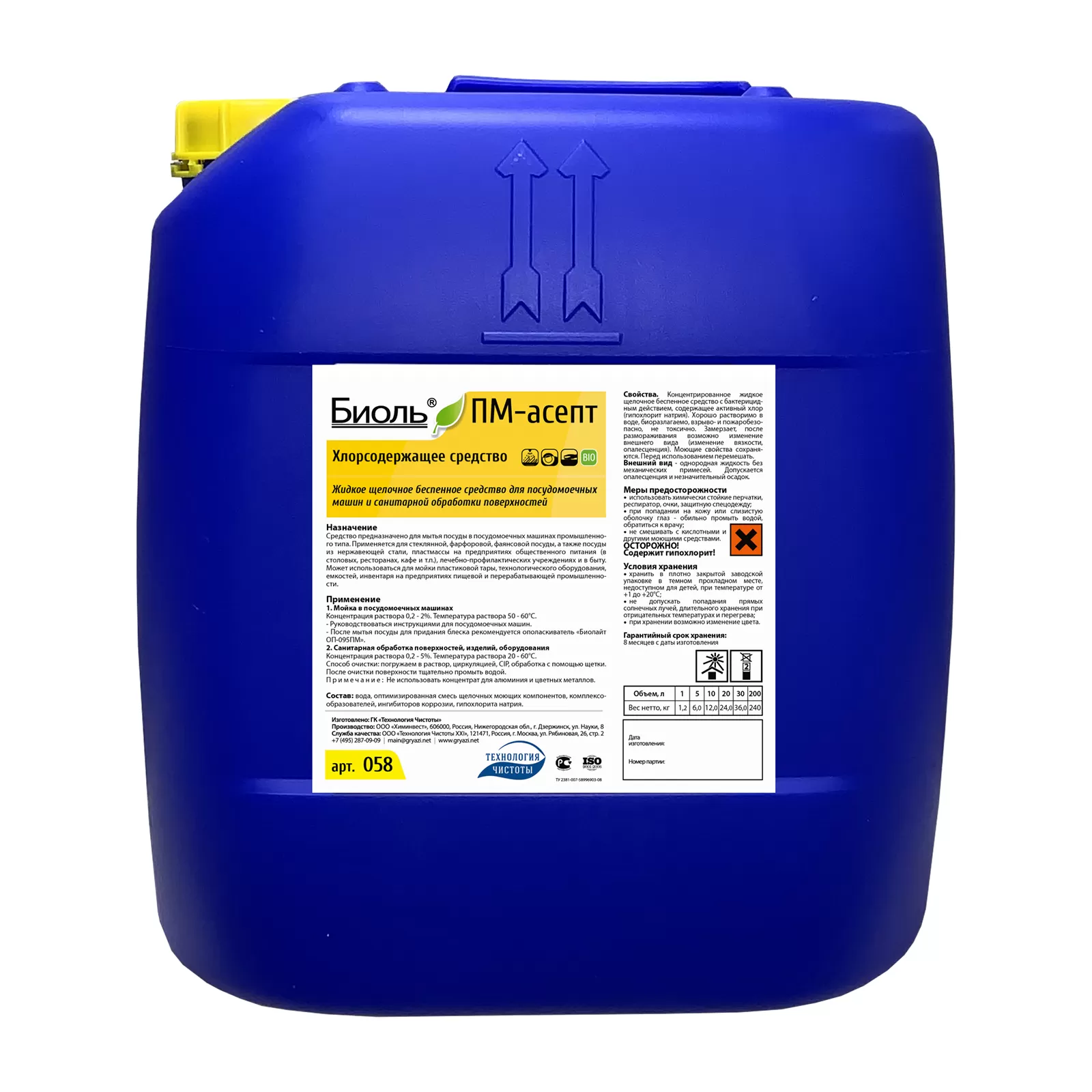 - Концентрированное жидкое щелочное беспенное средство, с бактерицидным действием, содержащее активный хлор (гипохлорит натрия).