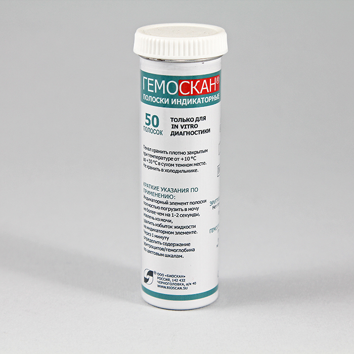 Полоски индикаторные ГЕМОСКАН предназначены для визуального (по цветовой шкале) экспресс-анализа содержания скрытой крови (эритроцитов/гемоглобина) в моче человека. Полоски могут быть использованы при массовых обследованиях здоровья населения, при обычных анализах мочи в клиниках и поликлиниках.