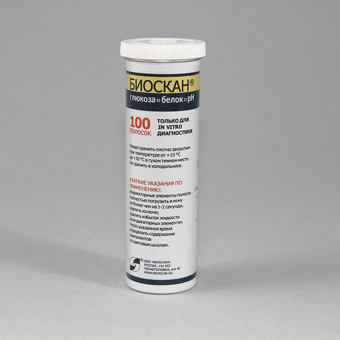Полоски индикаторные БИОСКАН-ГЛЮКОЗА, БЕЛОК, рН предназначены для визуального (по цветовым шкалам) экспресс-анализа содержания глюкозы, белка (альбумина) и уровня кислотности (рН) в моче человека. Полоски могут быть использованы при массовых обследованиях здоровья населения, при обычных анализах мочи в клиниках и поликлиниках, при регулярных анализах мочи у больных сахарным диабетом, а также при необходимости экстренной диагностики.