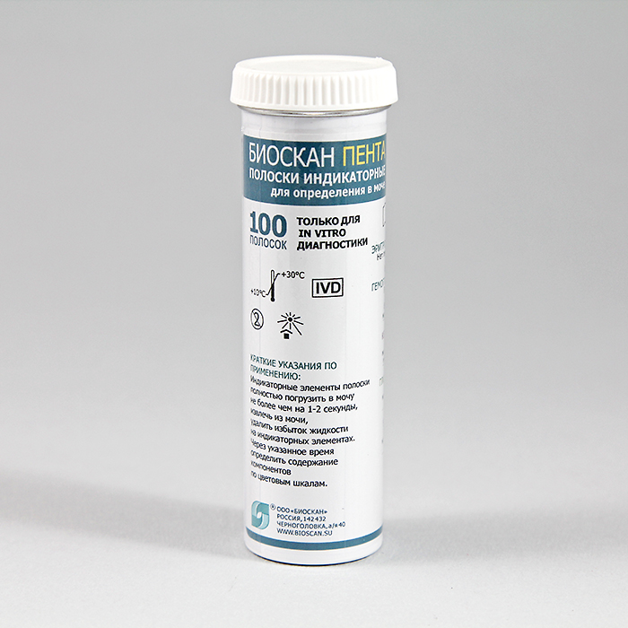 Полоски индикаторные БИОСКАН-ПЕНТА предназначены для визуального (по цветовым шкалам) экспресс-анализа содержания скрытой крови (гемоглобина/эритроцитов), кетонов (ацетоуксусной кислоты), глюкозы, белка (альбумина) и уровня кислотности (рН) в моче человека. Полоски могут быть использованы при массовых обследованиях здоровья населения, при обычных анализах мочи в клиниках и поликлиниках, при регулярных анализах мочи у больных сахарным диабетом, а также при необходимости экстренной диагностики.