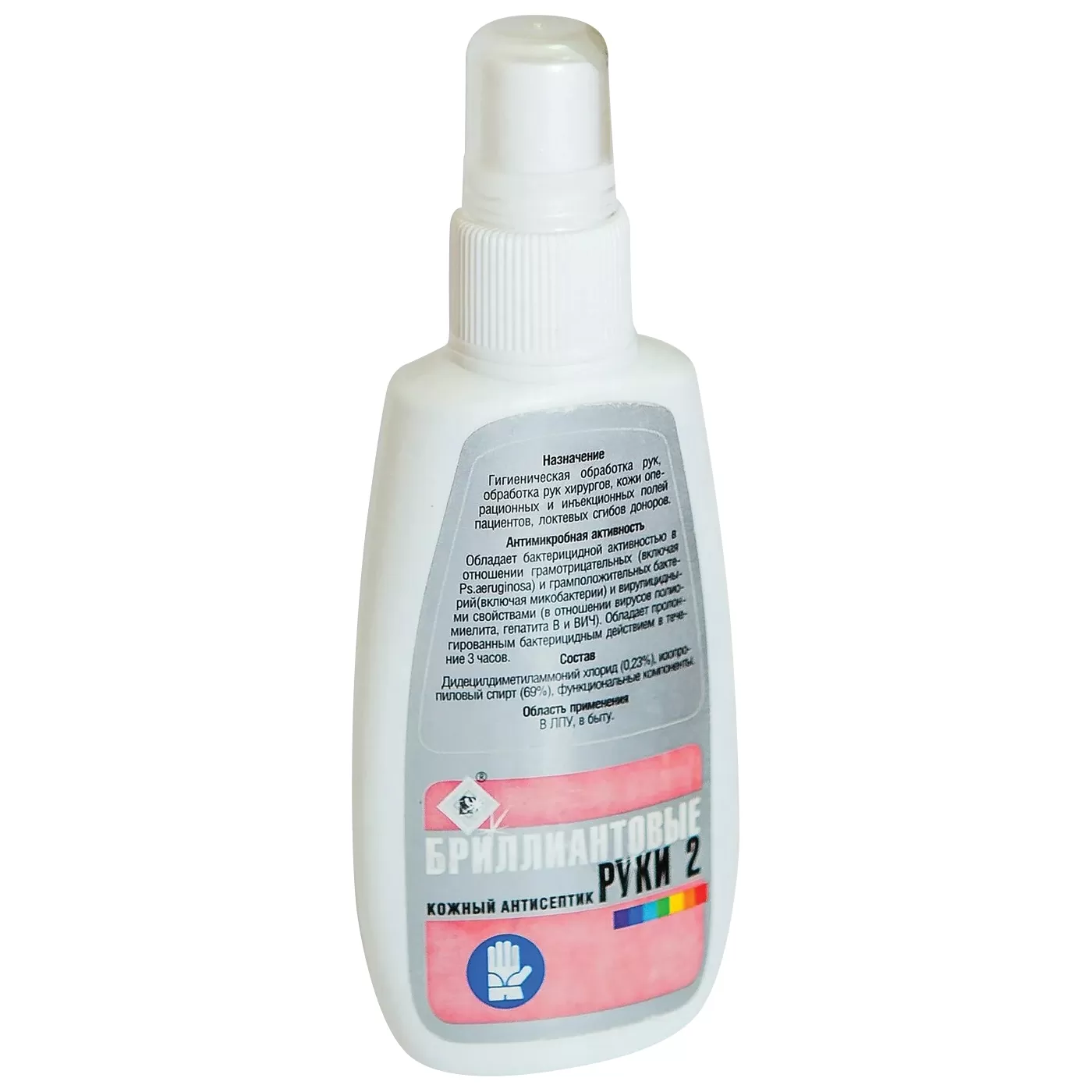 - Гигиеническая обработка рук - на кисти рук наносят 3 мл средства (без предварительного мытья рук водой с мылом) и втирают в кожу обеих кистей рук до полного высыхания, но не менее 30 секунд. При сильном загрязнении рук биологическими жидкостями, в том числе кровью, загрязнения удаляют тампоном или салфеткой смоченными средством «Бриллиантовые руки 2». Затем на кисти рук наносят 3 мл средства и втирают в кожу обеих кистей рук до полного высыхания, но не менее 30 секунд. После чего руки моют проточной водой с мылом.