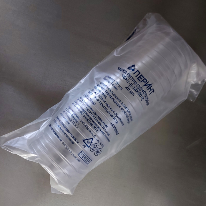Чашки Петри 90 мм стерильные односекционные предназначены для посева исследуемого материала на питательные среды для выделения чистых культур микроорганизмов, изучения свойств культур, их чувствительности и резистентности к антибиотикам при микробиологических исследованиях. На крышке расположены несколько вентиляционных опор, предотвращающие плотное прилегание крышки к чашке и обеспечивающие доступ воздуха.
