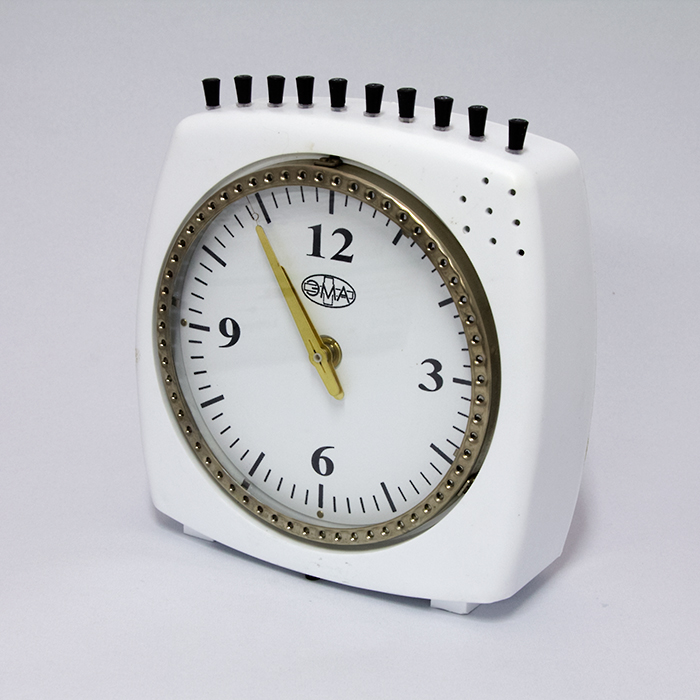 Часы настольные процедурные со звуковым сигналом ПЧ-3-01. Представляют собой часы с электронно-кварцевым механизмом, со звуковым сигналом окончания процедур, для подачи которого в корпусе часов вмонтирован зуммер, включаемый касанием конца минутной стрелки к специальным контактным штырькам, вставленным в отверстия на кольце циферблата.