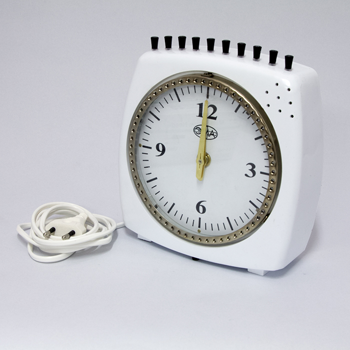 Часы настольные процедурные со звуковым сигналом ПЧ-3. Представляют собой часы с электронно-кварцевым механизмом, со звуковым сигналом окончания процедур, для подачи которого в корпусе часов вмонтирован зуммер, включаемый касанием конца минутной стрелки к специальным контактным штырькам, вставленным в отверстия на кольце циферблата.