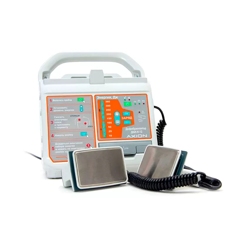 - Состоит из блока дефибрилляции с электродами, встроенного аккумулятора, сетевого шнура 1,8 м, с ручкой для переноски.