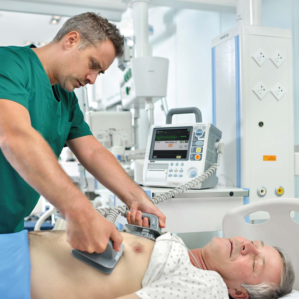 - Мощные аккумуляторные батареи поддерживают длительный непрерывный мониторинг и подачу разрядов во время транспортировки пациента без использования внешних источников питания