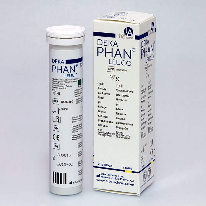 Тест-полоски ДекаФАН ЛЕЙКО предназначены для качественного и полуколичественного определения содержания скрытой крови, кетонов, глюкозы, белка, рН, билирубина, уробилиногена, нитритов, удельного веса, лейкоцитов в моче человека.