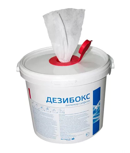 - Перед началом работы с дезинфицирующими средствами надеть резиновые перчатки. Поместить в диспенсер (приобретается отдельно) рулон салфеток для «ДЕЗИБОКС» вертикально, заполнить диспенсер рабочим раствором дезинфицирующего средства необходимой концентрации. Количество раствора зависит от количества и плотности используемых салфеток. Количество заполняемого раствора оценивается визуально с учётом, чтобы салфетки полностью пропитались, и раствор ещё остался в диспенсере на 1/2 высоты диспенсера. Как правило, достаточно 3,5-4,0 л раствора. Время пропитывания салфеток раствором составляет не менее 10-15 минут. После полного пропитывания салфеток раствором протяните через верхний дозирующий клапан крышки одну салфетку из центра рулона, далее плотно закройте крышку на диспенсере и крышку дозирующего клапана. Диспенсер готов к использованию. Для дозирования салфеток – откройте крышку дозирующего клапана и вытяните необходимое количество салфеток, закройте крышку дозирующего клапана. В процессе использования диспенсера необходимо следить за количеством раствора в диспенсере - во избежании высыхания салфеток. В случае необходимости долить раствор.