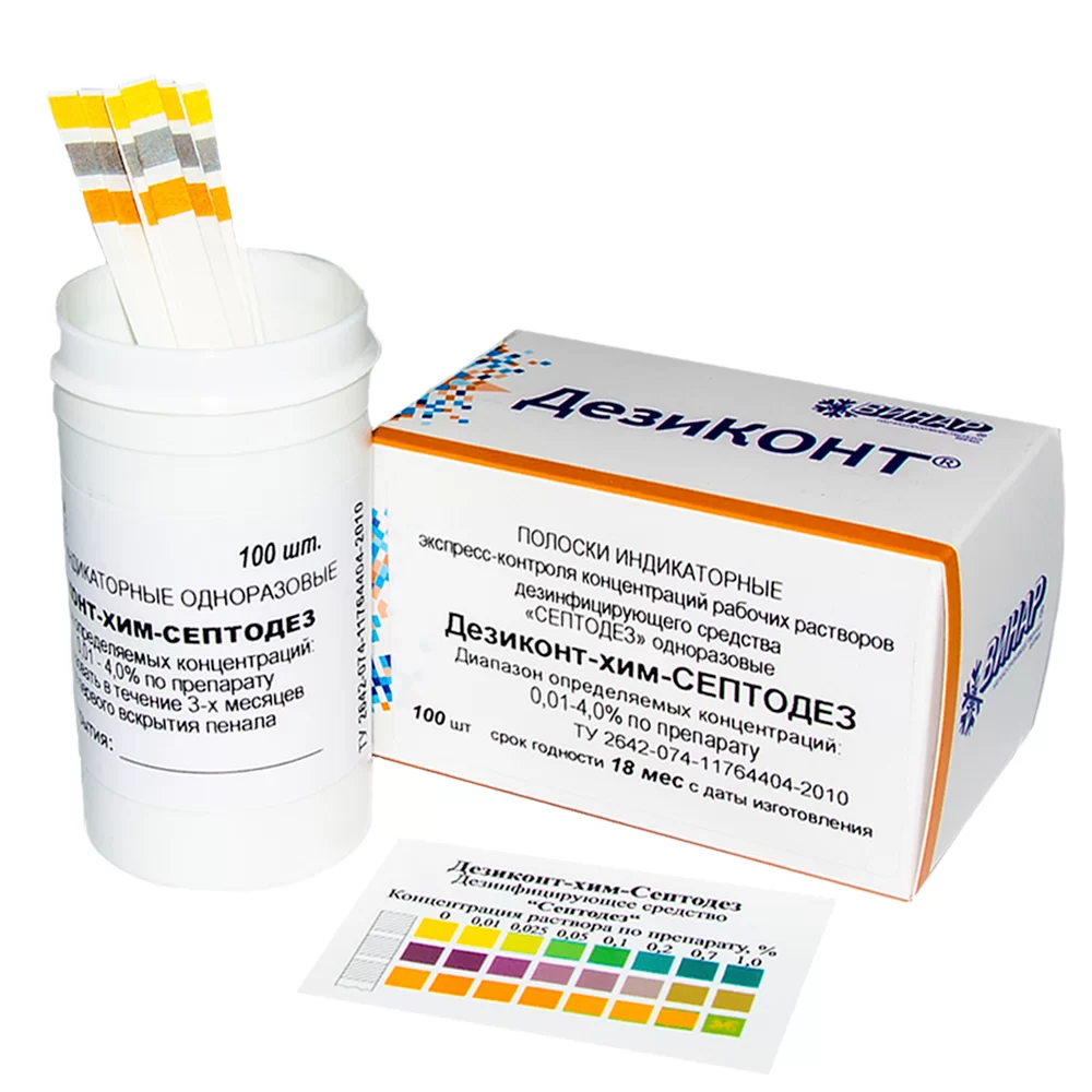 - Универсальных индикаторов для контроля концентрации дезинфицирующих растворов не существует — индикаторные полоски разрабатываются отдельно для каждого конкретного дезинфицирующего средства!