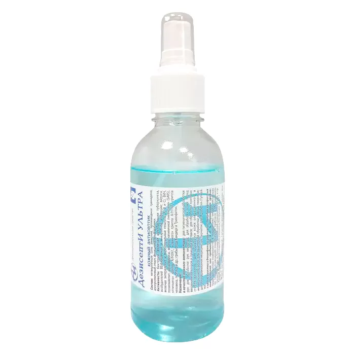 Средство «ДезисептИ УЛЬТРА» представляет собой готовую к применению прозрачную жидкость от бесцветного до синего цвета со слабым специфическим запахом или запахом отдушки.