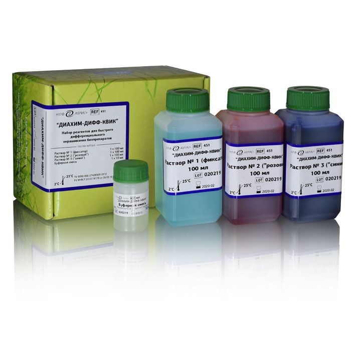 Набор реагентов Диахим-Дифф-Квик предназначен для быстрого дифференцированного окрашивания биопрепаратов (кровь, эякулят, выпотные жидкости и др.).