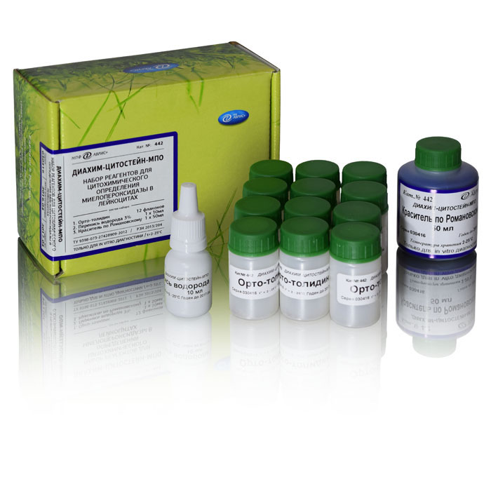 Набор реагентов Диахим-ЦитоСтейн-МПО предназначен для выявления миелопероксидазы в клеточных элементах (кровь, костный мозг). Используется для диагностики острых лейкозов и служит маркерной реакцией для диагностики миелолейкозов.