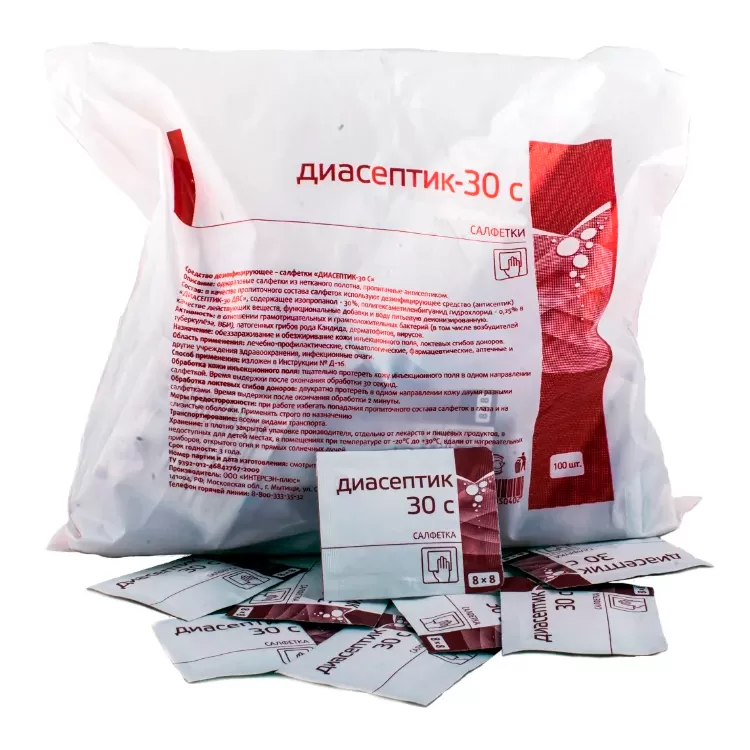 - в качестве пропиточного состава салфеток используют дезинфицирующее средство “ДИАСЕПТИК-30 ДВС”, содержащее изопропанол (пропанол-2) - 30%, полигексаметиленбигуанид гидрохлорид -0,25% в качестве действующих веществ, функциональные добавки, в том числе кондиционер воды, эмульгатор, смягчающие добавки и воду питьевую деионизированную.