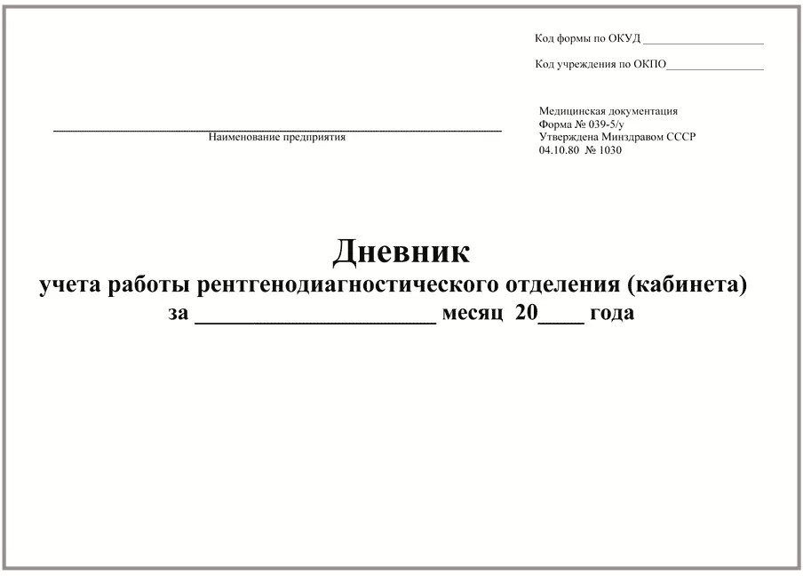 Дневник учета работы рентгенодиагностического отделения (кабинета), форма № 039-5/у ведется во всех лечебно-профилактических учреждениях, имеющих рентгенодиагностические отделения (кабинеты).