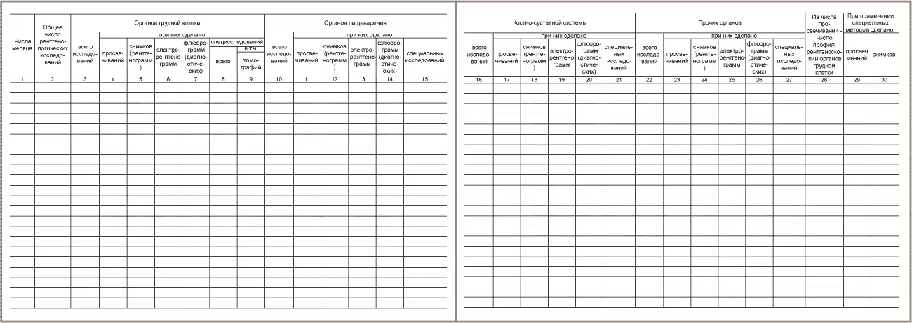 - Числа в гр. 3 могут равняться сумме чисел гр. 4, 5, 6, 7, 8, но, как правило, должны быть меньше этой суммы, т.к. при одном исследовании было сделано просвечивание, несколько снимков, электрорентгенограмм, флюорограмм и т.д.