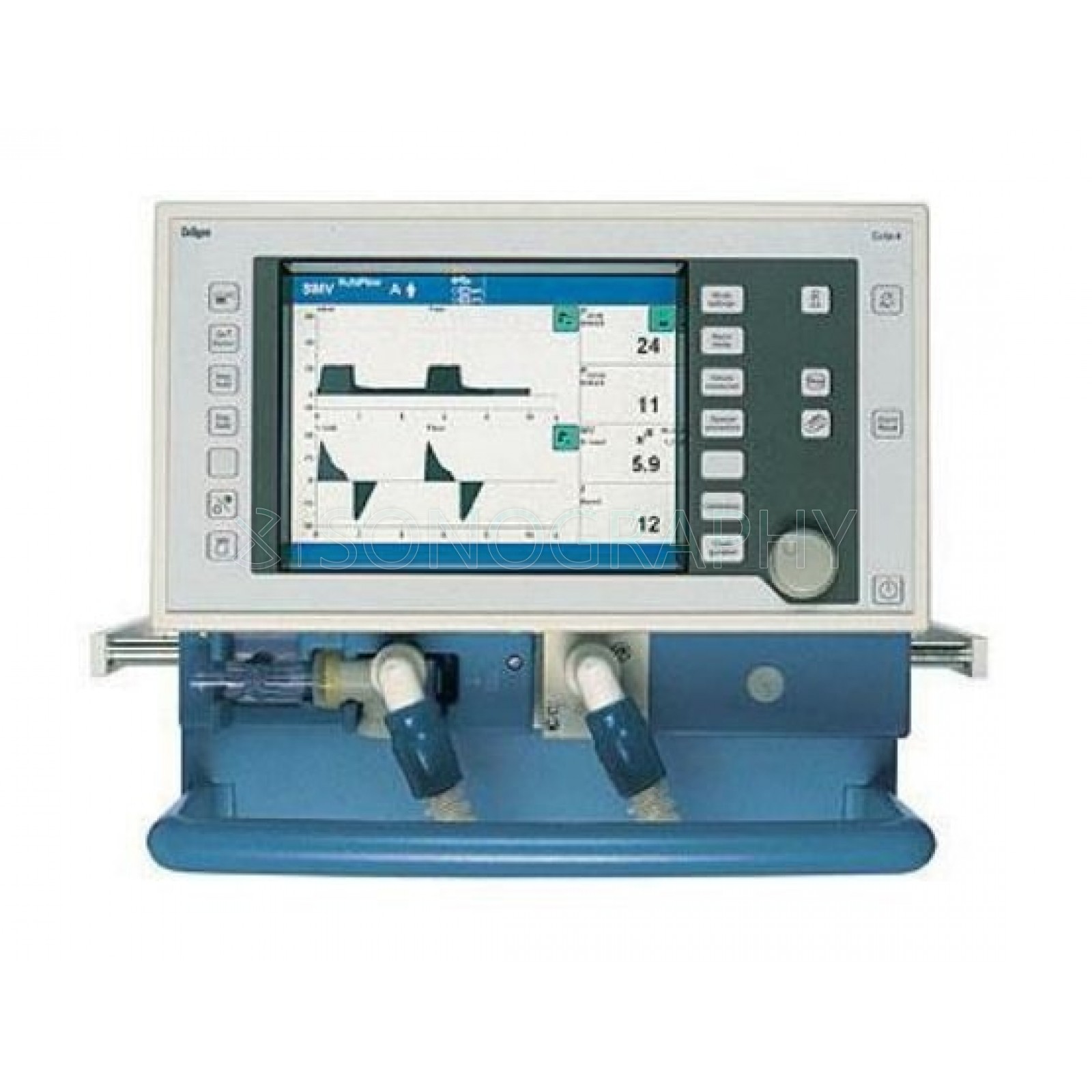 - Полностью интегрирован монитор с показателями давления, потока, объема, концентрации вдыхаемого кислорода, а также сопротивления, Compliance. Данные представлены в числовом и графическом выражении в виде кривых, петель или трендов.