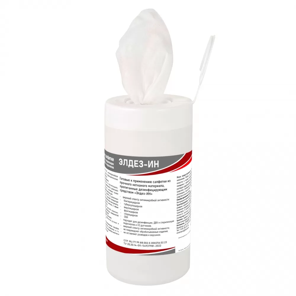 - Влажные салфетки в виде перфорированной ленты в емкости-диспенсере в виде банки из плотного полимерного материала с двойными зажимными крышками (внутренняя крышка с функциональной прорезью для извлечения одной салфетки) пропитанные дезраствором «Элдез-ИН».