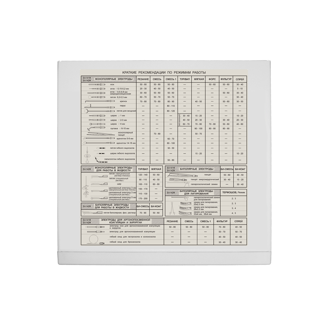 Аппарат комплектуется антипригарными биполярными пинцетами различной конфигурации, зажимами для лигирования сосудов как для открытой хирургии, так и для лапароскопии, может работать с моно- и биполярными резектоскопами любых фирм-производителей.