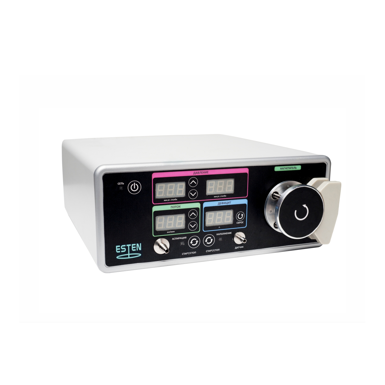Прибор имеет модуль аспирации (отсоса) с 2 уровневой системой контроля переполнения емкости. Прецизионный роликовый (перистальтический) насос обеспечивает высокоточное поддержание скорости подачи жидкости и давления в полости.