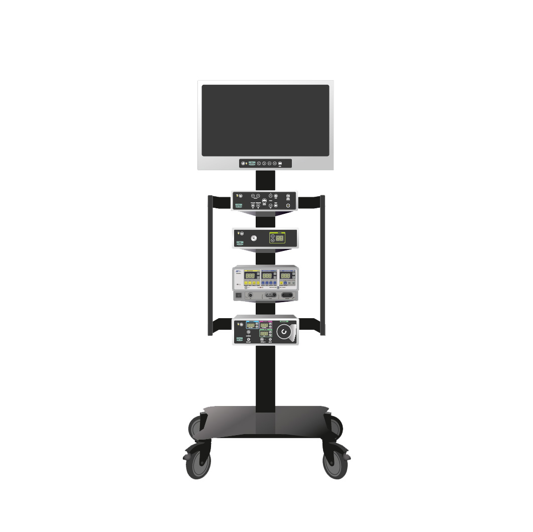 Стойка передвижная для эндоскопических аппаратов и устройств предназначена для установки и перемещения аппаратов и устройств для эндоскопической хирургии. Стойка выполнена из высококачественных материалов: алюминий, нержавеющая сталь. Данная модель стойки имеет 4 полки.