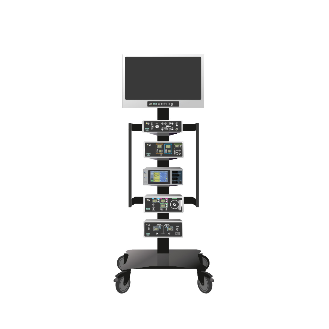 Стойка передвижная для эндоскопических аппаратов и устройств предназначена для установки и перемещения аппаратов и устройств для эндоскопической хирургии. Стойка выполнена из высококачественных материалов: алюминий, нержавеющая сталь. Данная модель стойки имеет 5 полок.