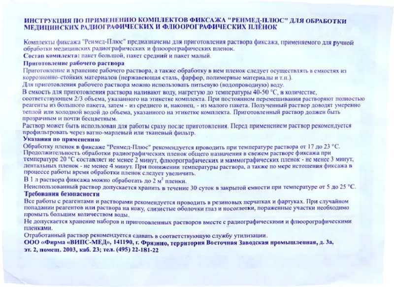 - Обработку плёнок фиксажом Ренмед можно проводить при температуре раствора от 17 до 23°С.