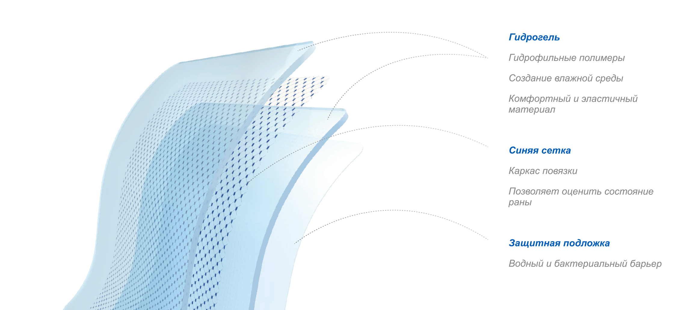 Ключевой механизм действия повязки основан на поддержании оптимально влажной среды в ране. При наложении на сухие раны с минимальной экссудацией гидрогель увлажняет раневое ложе, размягчая и облегчая удаление некротических тканей и фибринозного налета, что способствует естественному очищению (аутолитической санации). При появлении экссудата повязка абсорбирует избыток жидкости, предотвращая мацерацию окружающих здоровых тканей.