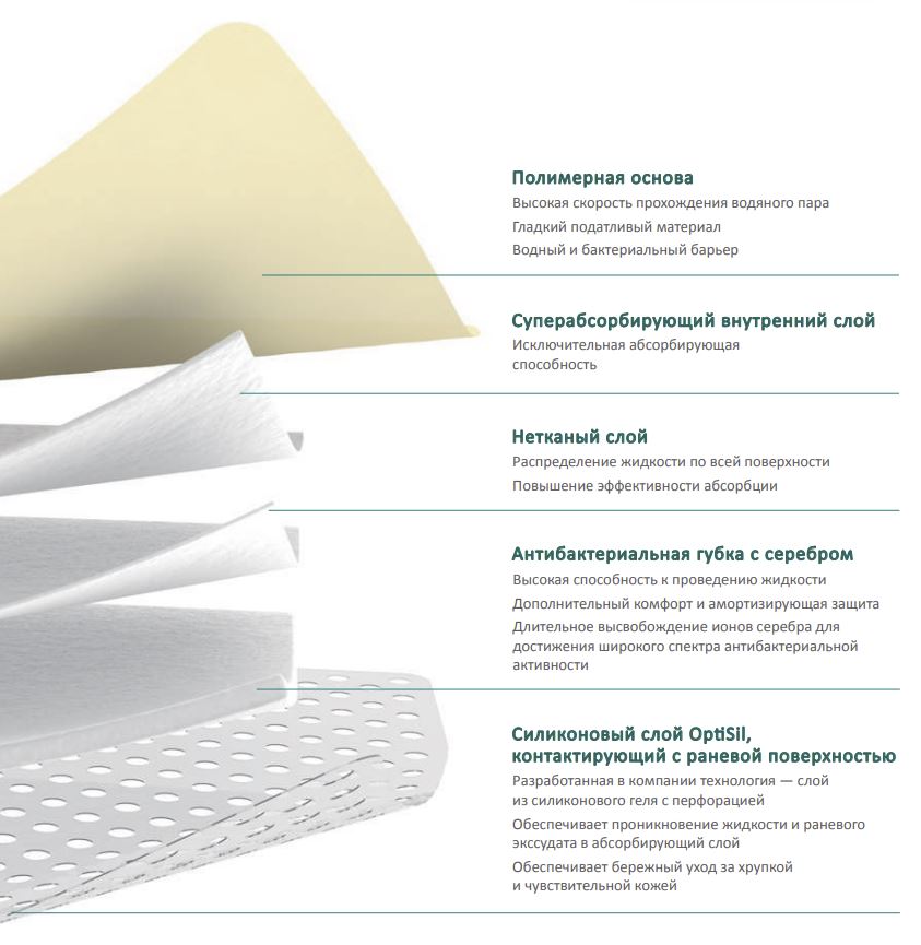 Абсорбирующий слой — гидрофильная пенополиуретановая губка, содержащая ионы серебра, которая эффективно впитывает экссудат и трансформирует его в гель.