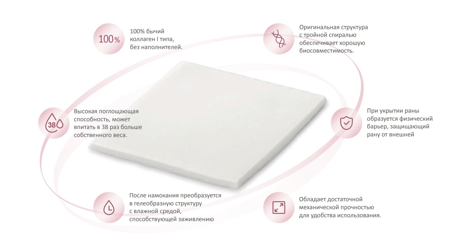 При контакте с раневым отделяемым волокна коллагена образуют мягкий биодеградируемый гель, который плотно и атравматично заполняет раневое ложе любой формы, поддерживая оптимальный баланс влажности. Это ключевое условие для успешного заживления без образования сухой корки. Помимо роли каркаса, повязка выполняет важную биохимическую функцию: она связывает и инактивирует избыточные матриксные металлопротеиназы (ММП) — ферменты, которые в хронических ранах разрушают факторы роста и только что образовавшийся внеклеточный матрикс, препятствуя заживлению. Также коллаген способствует остановке капиллярного кровотечения (гемостаз).