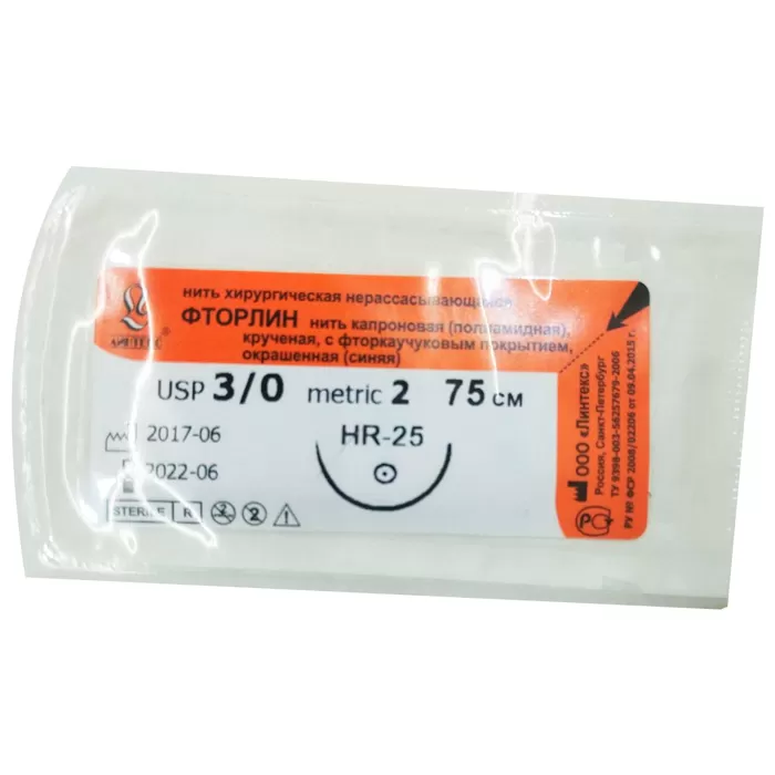 ФТОРЛИН - нерассасывающиеся плетеные или крученые капроновые (полиамидные) нити с фторполимерным покрытием. Фторполимерное покрытие полностью устраняет капиллярность и фитильность нитей, улучшает биосовместимость, повышает надежность хирургического узла, обеспечивает атравматичность при проведении через ткани. Нити прочны, гибки, удобны в манипуляциях и не требуют наложения дополнительных узлов для надежной фиксации шва. Отличаются обратимым удлинением (пружинят) на 25-30% при приложении нагрузки, что позволяет создать постоянную компрессию тканей при отеке и избежать прорезания их швами.
