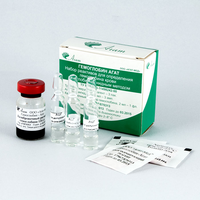 Диагностический набор ГЕМОГЛОБИН АГАТ предназначен для количественного определения содержания гемоглобина в крови гемиглобинцианидным методом (метод Drabkin) в клинико-диагностических и биохимических лабораториях.