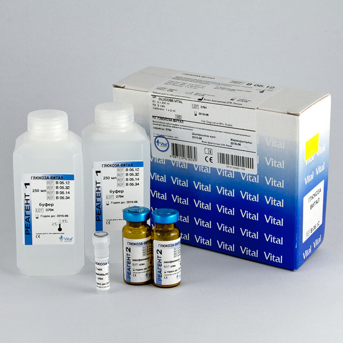Диагностический набор ГЛЮКОЗА-ВИТАЛ для количественного определения содержания глюкозы в сыворотке, плазме крови или моче глокозооксидазным методом без депротеинизации.