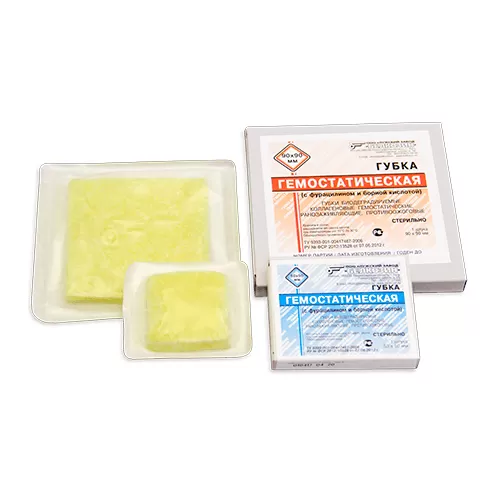 Губку гемостатическую готовят из раствора коллагена. В состав губки входят борная кислота и фурацилин.