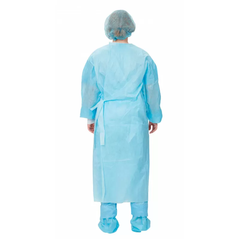 - Запах халата расположен со спины и фиксируется посредством завязок, приваренных к нетканому полотну с помощью ультразвуковой сварки. 4 завязки и дополнительный запах обеспечивают полное покрытие спины.